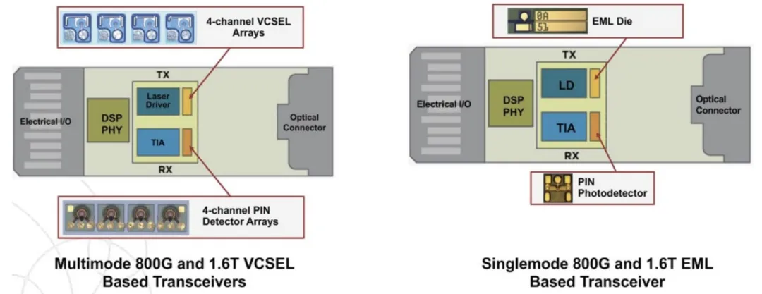 图 5:VCSEL 激光直接调制,而 EML 使用 EA 或 DFB-MZ 调制,在长距离高速下保持信号完整性