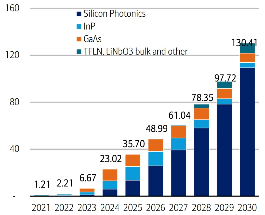 图 6:到 2030 年,AI 光学元件可以达到 1.3 亿单位,由硅基光电子主导