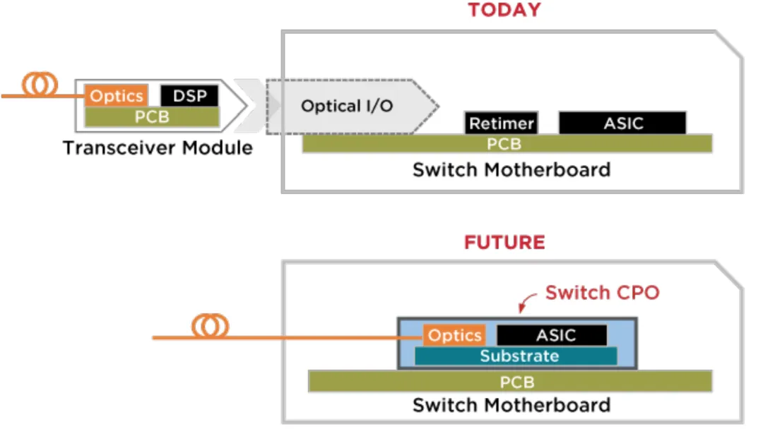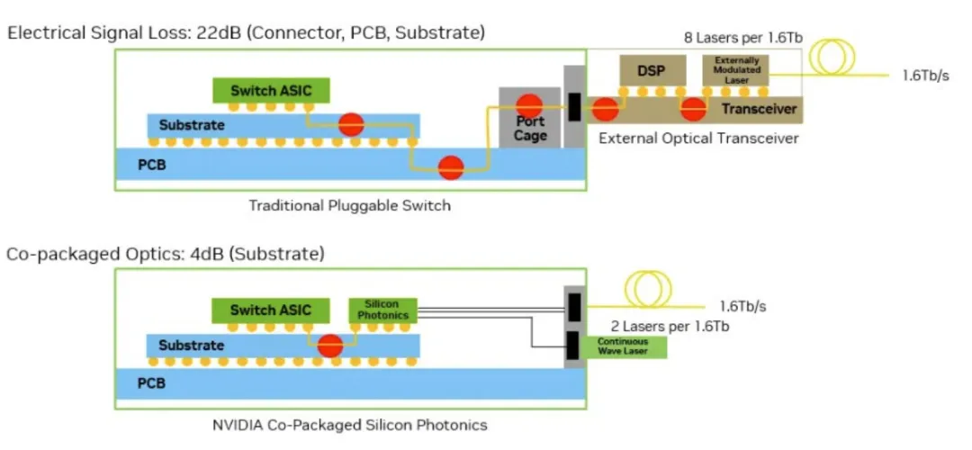 CPO 根本改变了这种架构,将光 - 电转换直接重新定位到交换机封装基板上,紧邻 ASIC 裸片。数据信号现在只传输几毫米而不是几英寸,并通过先进封装互连而不是损耗性 PCB 走线。这大幅降低电信号损耗,从约 22 分贝降至 NVIDIA Spectrum-X 交换机实现中的仅 1-2 分贝。
