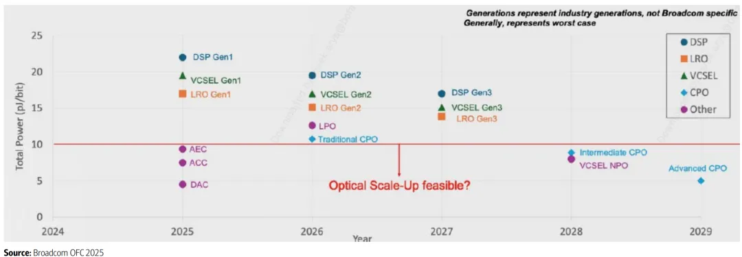 图 10:未来的 CPO 解决方案可能拥有与铜基解决方案相媲美的能源效率,这将使光学元件在扩展中的渗透成为越来越大的可能性