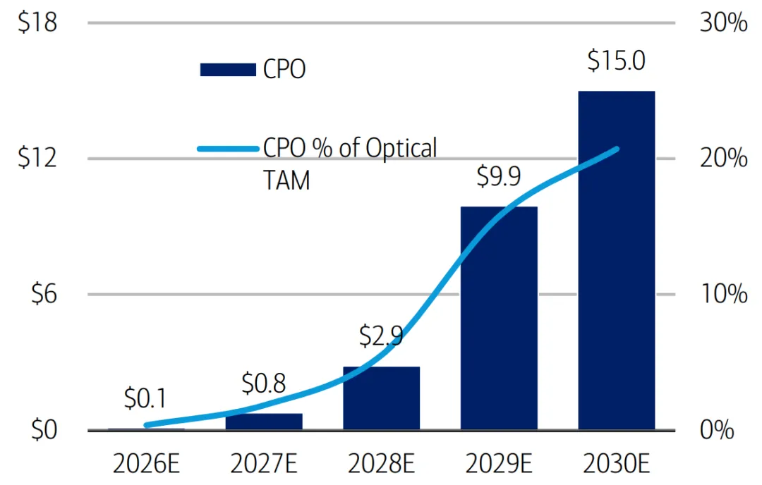 图 11:到 2030 年,150 亿美元的销售额,CPO 可能占光学 TAM 的 20%