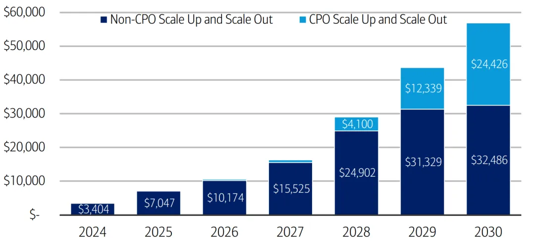 相比之下,扩展网络今天几乎完全基于铜。初始扩展 CPO 部署可能最早在 2027 年底开始,到 2030 年快速增加,达到 90 亿美元的市场 —— 占整体 CPO 总潜在市场的 60%,大于 56 亿美元的扩容机会。扩展带宽需求是扩容的 9 倍,协定完全是专有的,与 XPU 紧密耦合,市场代表真正的蓝海机会,没有现有的光学解决方案可蚕食。