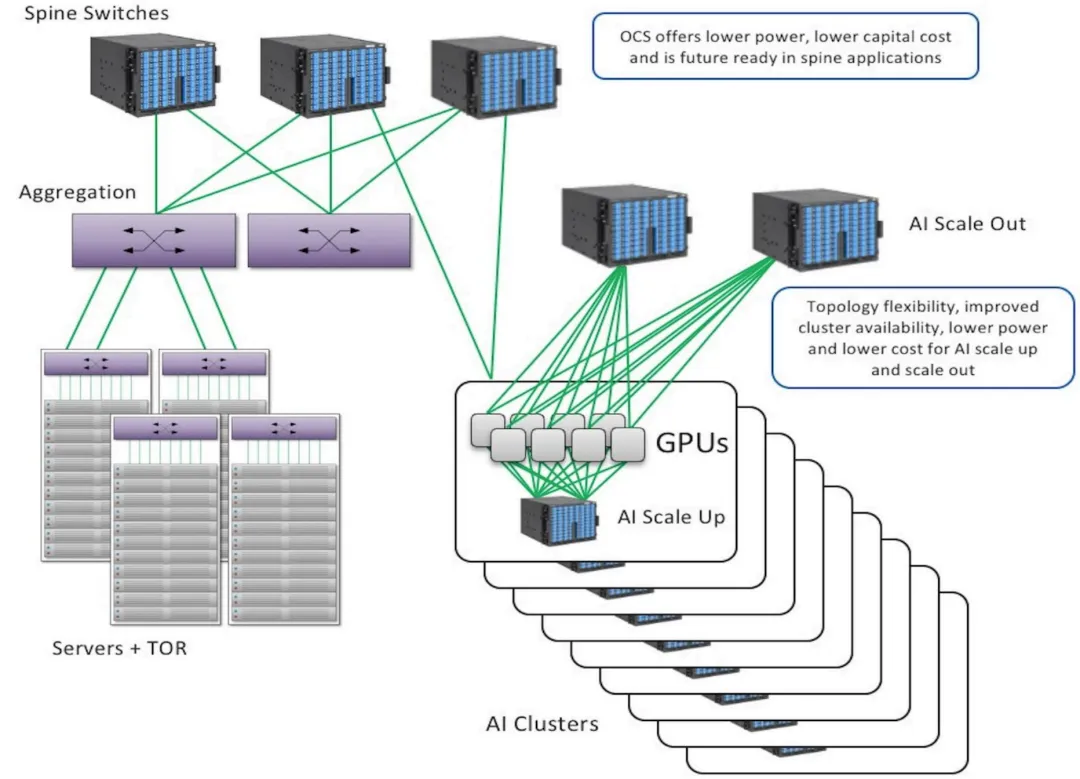 冗余代表第三个关键应用。考虑到现代 AI 网络的巨大规模,故障点是不可避免的。OCS 实现将光路重新路由到替代服务器或加速器(如果发生问题),确保持续正常运行时间。这减少了以整个网络停机为代价修复节点所花费的时间和资源,同时通过简单地重新平衡远离受影响节点的流量使维护变得简单。OCS 插入可以发生在各种聚合层之间或朝向更高的网络层。