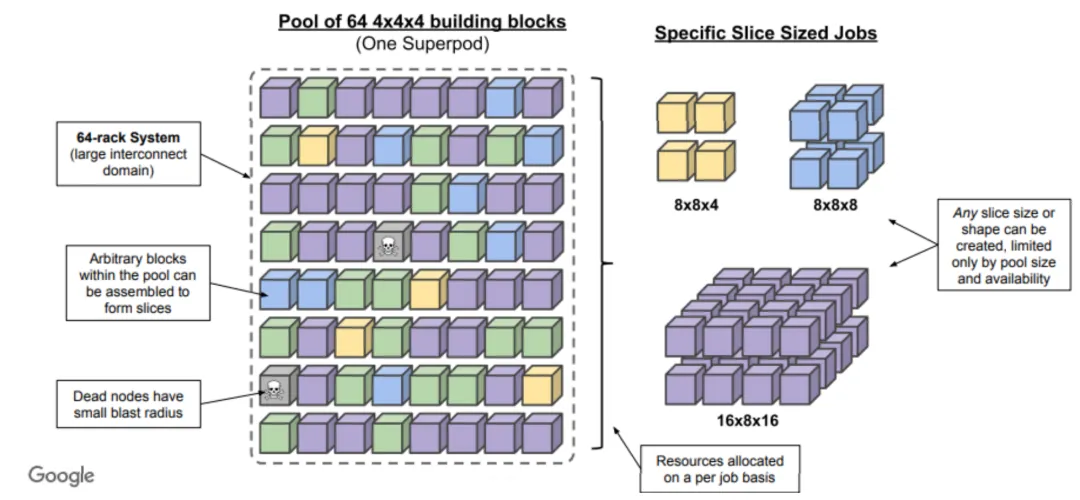 图 16:在多个 4x4x4 TPU 立方体的超级集群内,可以互连 TPU 的各种组合和切片,以专注于不同的工作负载,同时避免故障节点