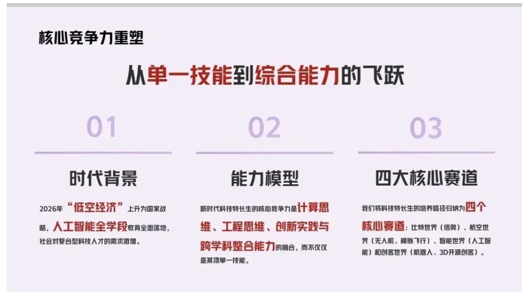 从“低空经济”上升为国家战略,到人工智能教育全学段落地,再到产业界提前锁定高中生人才——这些信号都指明,科技特长生的核心竞争力,已从“单一竞赛技能”升维为 “计算思维、工程思维、创新实践与跨学科整合” 的复合能力。