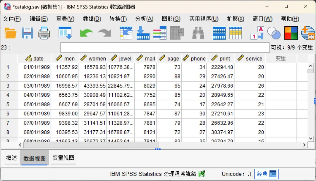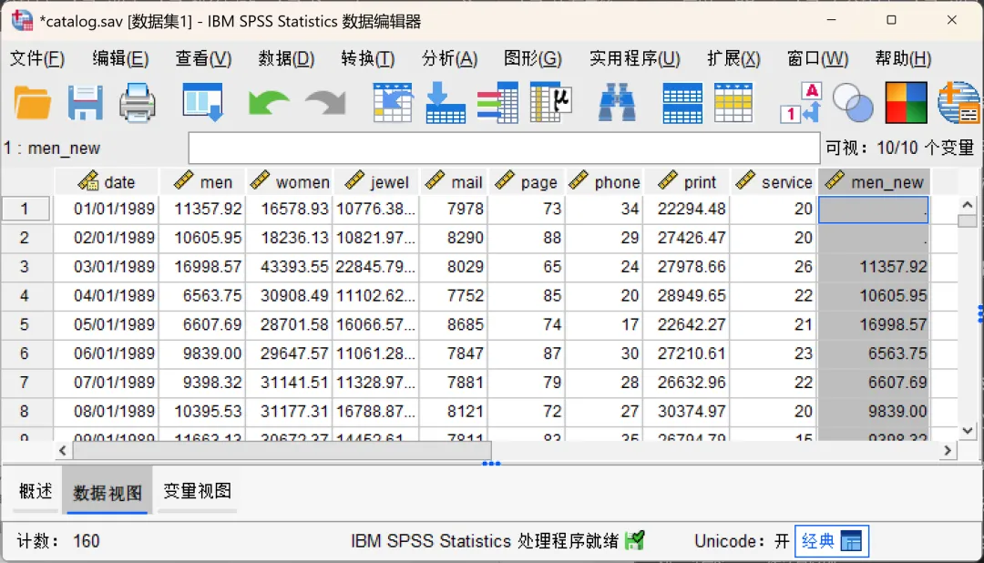 设置完成,点击确定,SPSS会在数据视图的最右侧生成一列新的变量,即计算结果。因之前设置了从前2个个案获取值(滞后2步),可以看到新变量的前2行显示「.」(系统缺失值),后续行依次提取前2行原始数据。