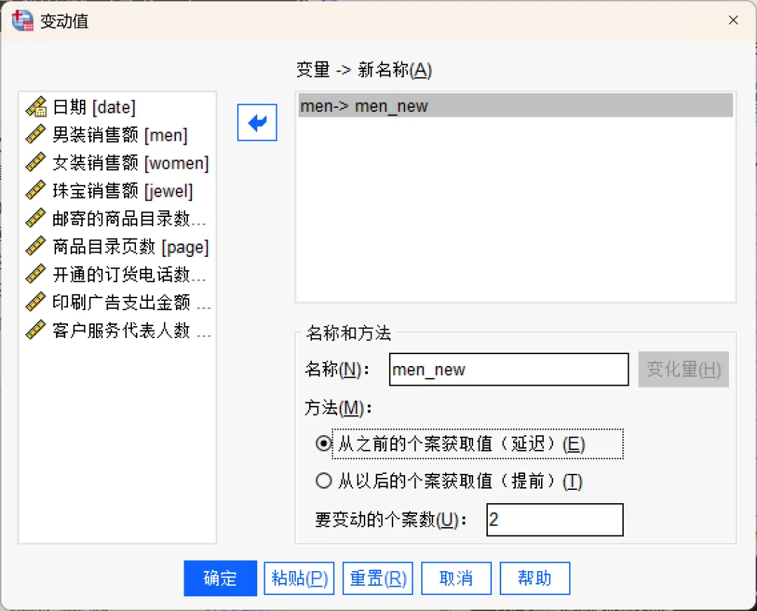 滞后(Lag):从前面的个案取值,比如第2行取第1行的值,第3行取第2行的值,适合计算环比、滞后效应、前期值对比。