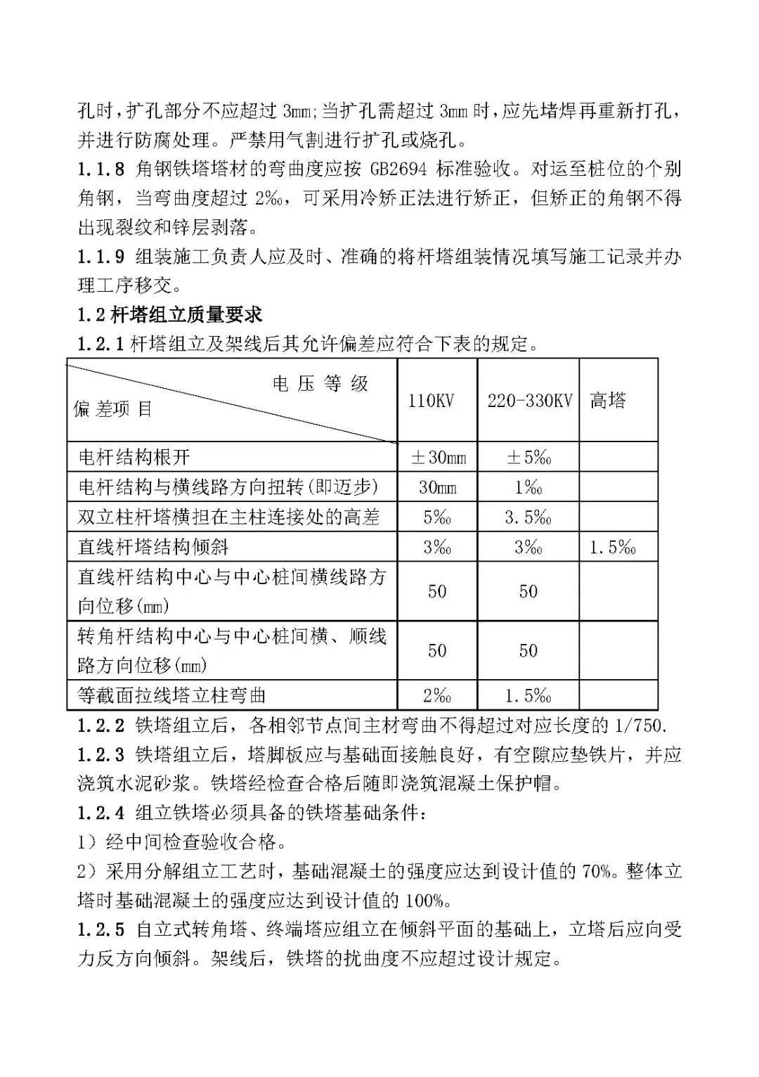 1.2.5 自立式转角塔、终端塔应组立在倾斜平面的基础上,立塔后应向受力反方向倾斜。架线后,铁塔的扰曲度不应超过设计规定。