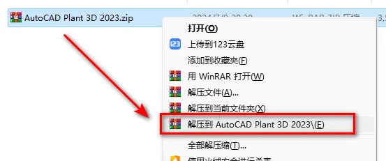 1.鼠标右键解压到“AutoCAD Plant 3D 2023”,解压之前必须关闭杀毒软件,不然破解文件解压后文件夹显示为空。
