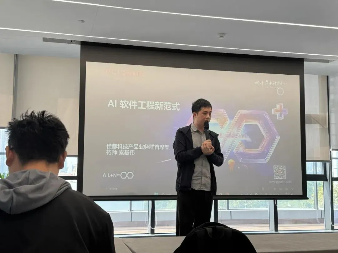 当日下午,佳都软件首席架构师秦基伟先生为同学们带来了题为《AI 软件工程新范式》的专题演讲。秦总以人工智能技术的发展趋势为切入点,深度剖析了在 AI 时代背景下,软件工程在开发、测试、维护等关键环节的创新路径与行业新范式。同时,他结合企业实际项目案例,生动地分享了 AI 技术在软件开发中的应用场景与实践经验。在互动答疑环节,同学们围绕 AI 技术伦理规范、软件开发职业发展路径、专业技术学习重点等热门话题积极提问,秦总耐心细致地逐一解答,并为同学们的成长给出了宝贵建议,助力大家构建起对行业前沿的清晰认知。