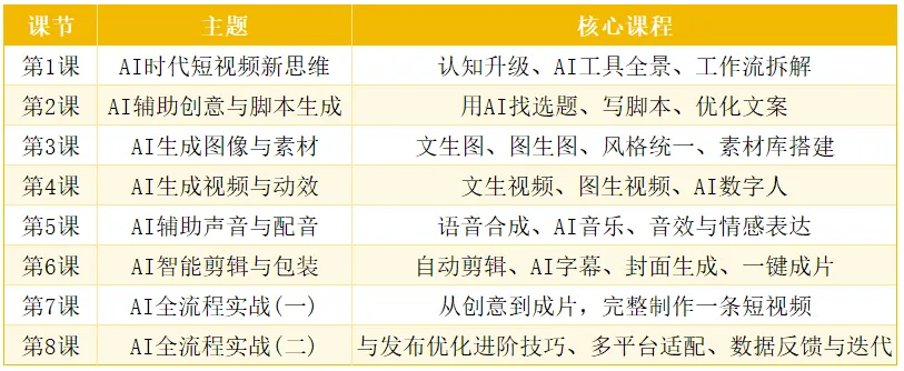本课程聚焦 AI 短视频全流程实战,从 AI 文案生成、智能剪辑、配音字幕到爆款脚本创作,零基础也能快速上手。通过实操教学,掌握 AI 工具高效制作短视频的技巧,助力自媒体、电商与营销从业者提升内容产出效率,轻松打造优质短视频作品。