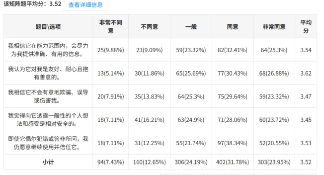 数据显示,57.3% 的用户同意或非常同意AI是 “友好、耐心且抱有善意” 的。这得益于AI被设计成礼貌、耐心的交互风格,形成了良好的第一印象。