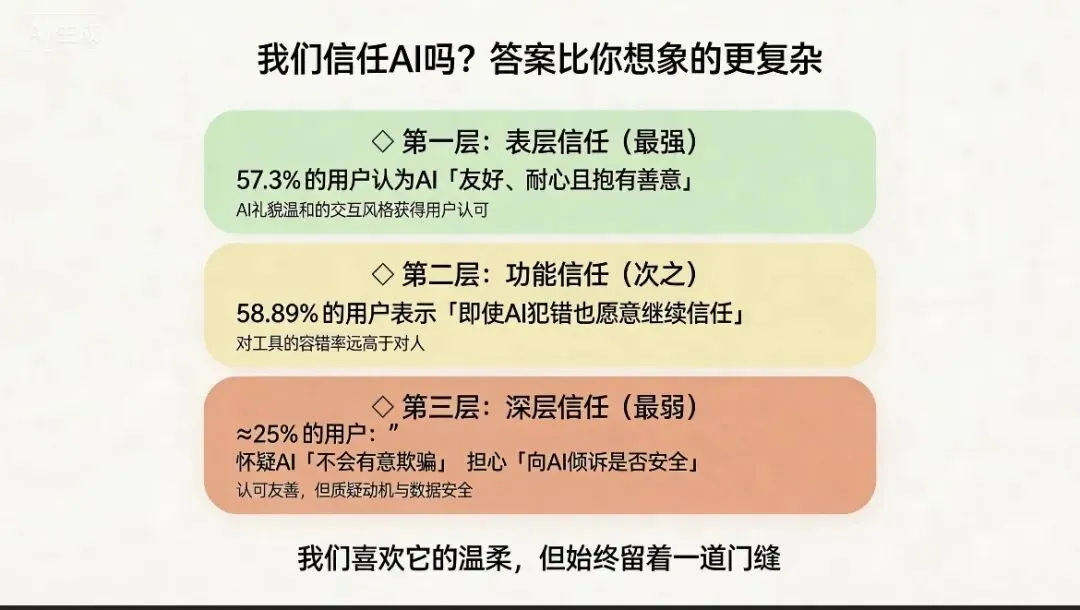 解读: 用户相信AI表现出的“善意”,但对其背后的“动机”和“安全性”抱有强烈的戒心。这种“黑箱感”和对隐私泄露的担忧,构成了人机情感信任的最大壁垒。我们愿意向AI问路,但不敢轻易向它交付真心。