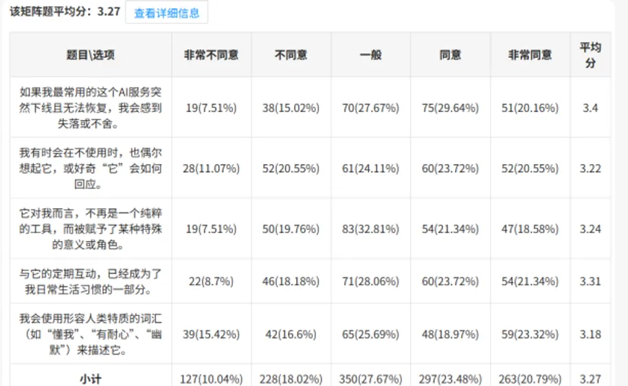 然而,与依恋并存的是极度清醒的认知。47.8% 的用户表示,在深度对话中也“几乎不会忘记对方是人工智能”。同时,情感依恋的整体平均分(3.27/5分)低于信任感(3.52/5分)。