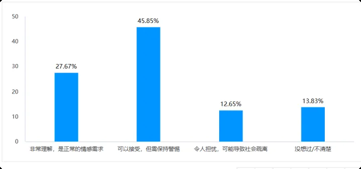一位受访者的态度或许可以概括这种矛盾心态:“非常理解,是正常的情感需求(45.85%)”,但同时,“可接受,但需保持警惕(27.67%)”。
