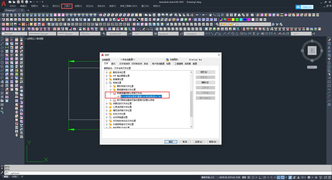也可以在 “ 工具—选项—样板设置—快速新建的默认样板文件名”。