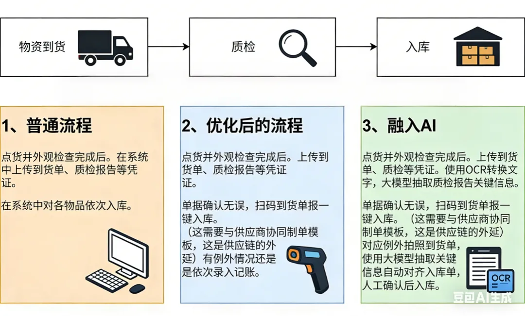对于备件、零件种类繁多的生产型企业,即便已经完成供应链协同,仍会遇到大量无法制码的例外场景。AI的引入,可以成为现有体系的有效补充。同时,大模型对单据、报告的数据抽取能力,也能大幅提升质检信息追溯效率,让物资管理更精准。