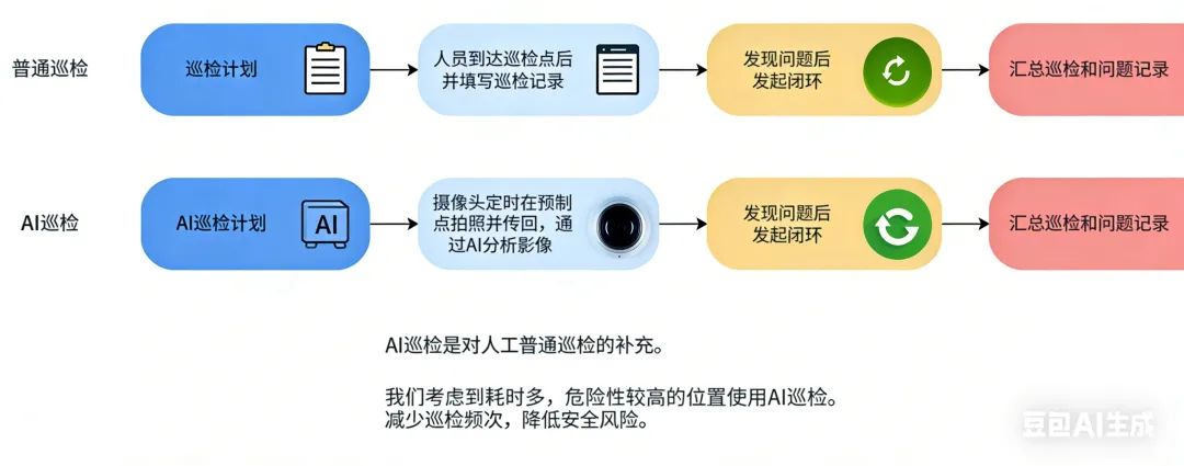 引入AI巡检后,通过摄像头智能识别仪表读数、跑冒滴漏等异常,高空点位从每2小时一巡,降低为每日人工复核一次,工作强度大幅下降。优化后,单班次仅需3人即可完成全部巡检工作,仅这一个岗位就精简了三分之一人力,安全与效率同步提升。