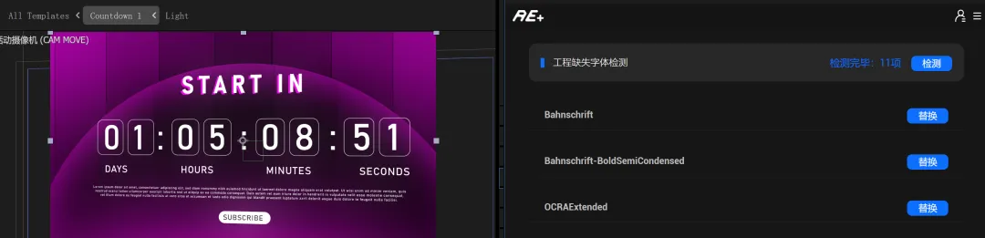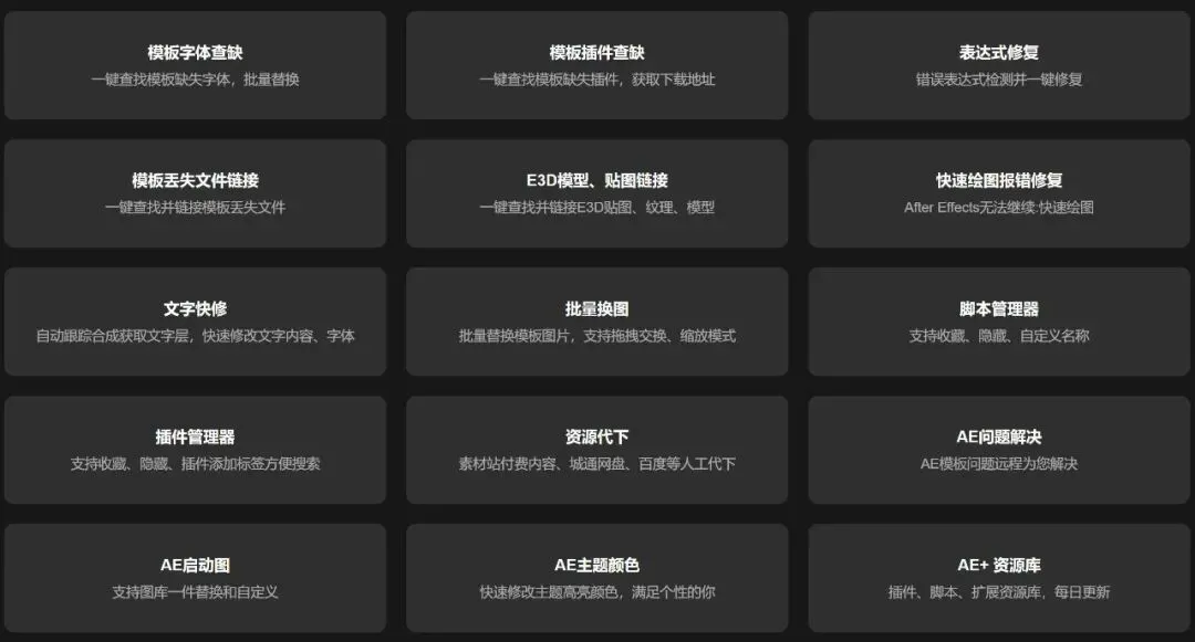 支持一站式检测模板运行常见问题,涵盖缺失字体、插件、表达式报错、文件丢失、E3D 模型 / 贴图 / 纹理丢失等各类故障;内置实用修复工具:缺失字体一键替换、表达式自动修复、文件及 E3D 资源一键链接;新增「AE 无法继续 - 快速绘图」功能,一键解决绘图类报错问题;针对缺失插件,可自动检索并提供下载链接,轻松获取所需插件。