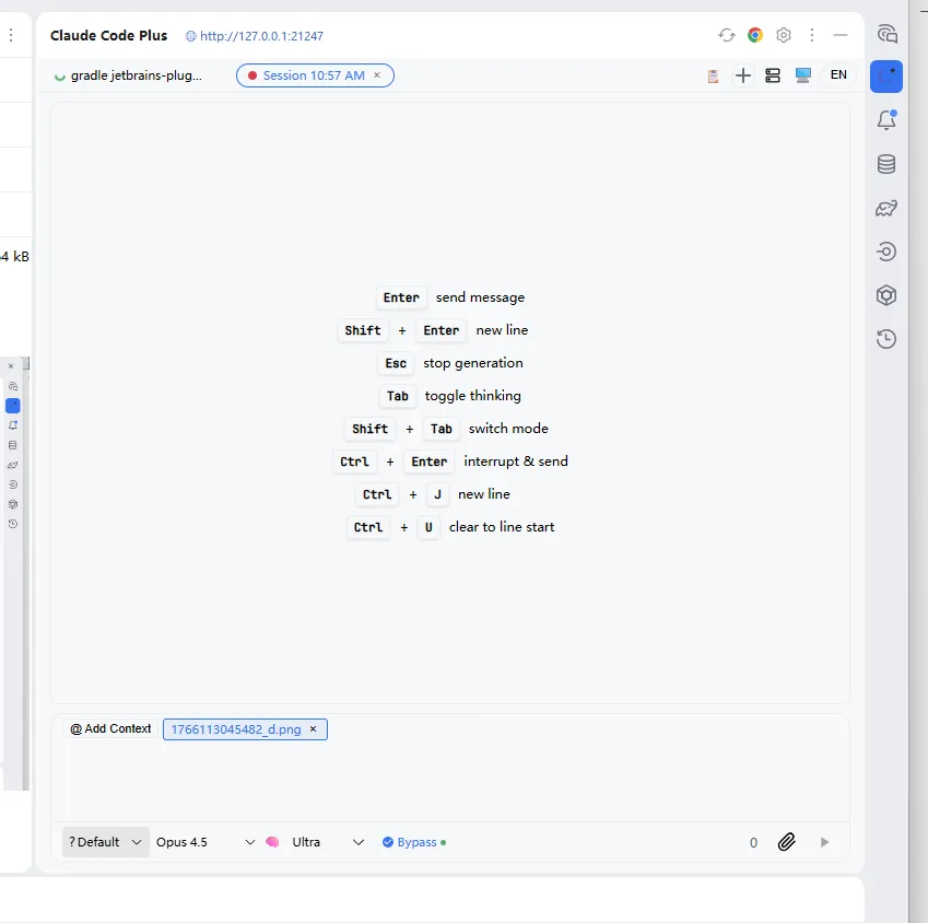 图形化聊天界面是最直接的区别。打开右侧边栏的 Claude Code Plus 工具窗口,就是一个聊天面板,输入问题,流式输出回答,对话历史都在这里,不用去终端翻。