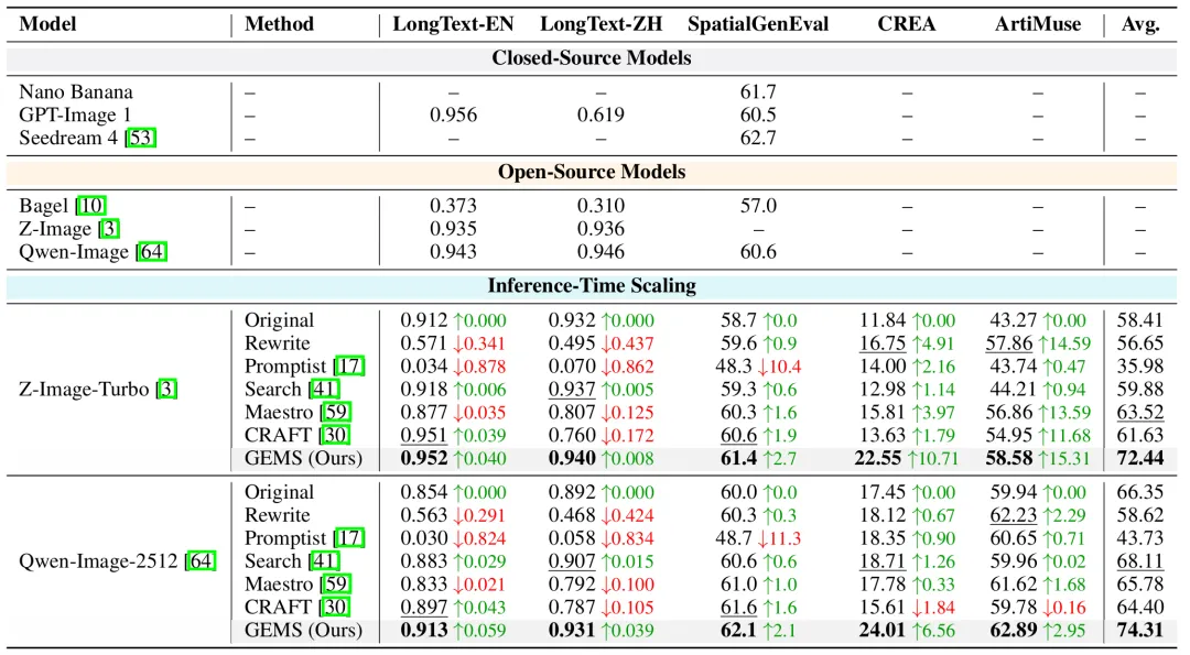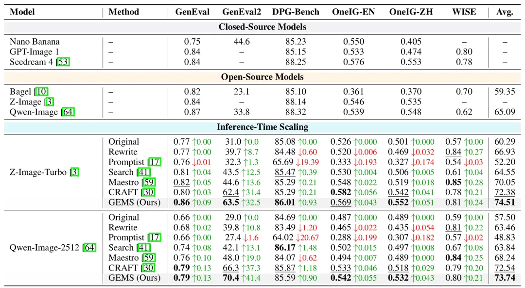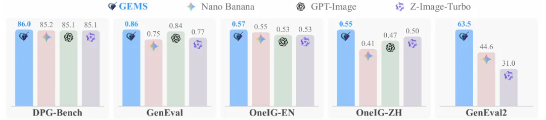 基于Z-Image-Turbo,在主流任务平均+14.22。在下游任务上,超越最好baseline +8.92,展现了GEMS框架的有效性