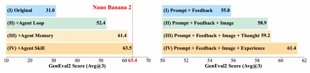 左图展示了通过逐步加入Agent Loop,Agent Memory,Agent Skill等模块,性能逐渐提升,甚至使得6B的Z-Image-Turbo在GenEval2上超越了Nano Banana 2。