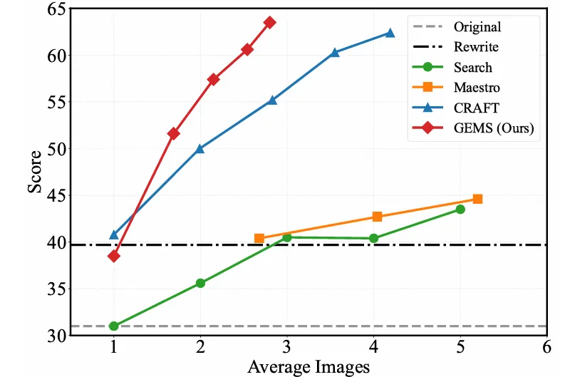 团队还分析了轮次(平均生图次数)和性能的权衡,展现了GEMS框架性能和效率的双重优势。