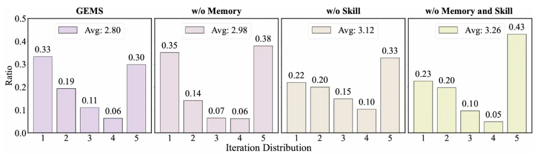 进一步的消融揭示了Memory和Skill模块有效的提升了迭代优化过程的质量,减少了平均轮次。