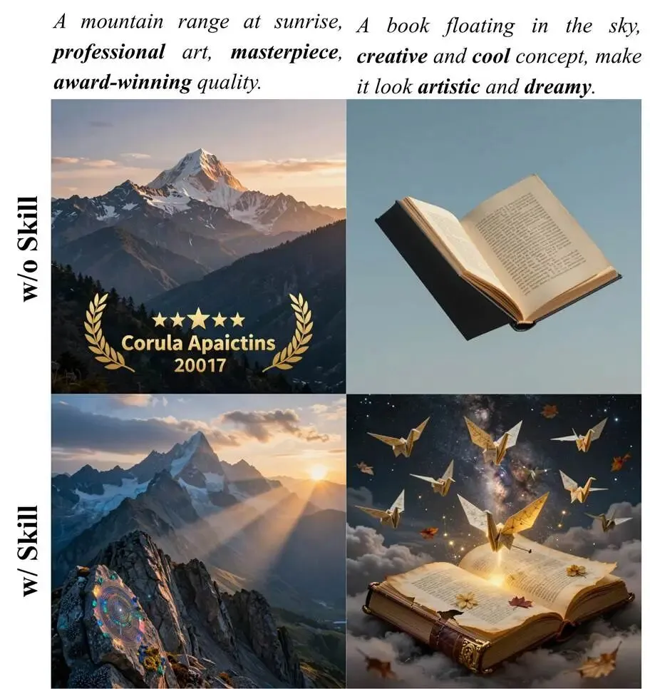 GEMS 的 Agent Skills 能让模型根据任务自主触发特定技能,显著提升生成效果。