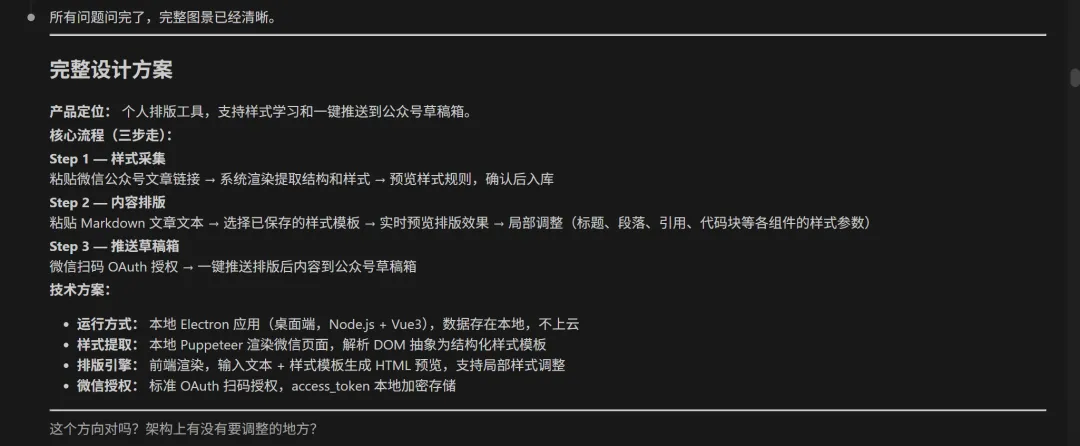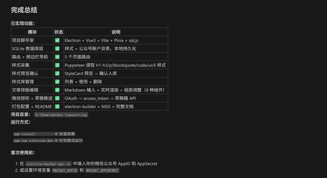 Electron 做桌面应用,Node.js + Vue3 SQLite,但用的是 sql.js(纯 JS 版本,不需要装数据库软件,装上就能跑) Puppeteer 渲染微信页面,提取 DOM 的计算样式 marked 解析 Markdown,前端直接渲染预览