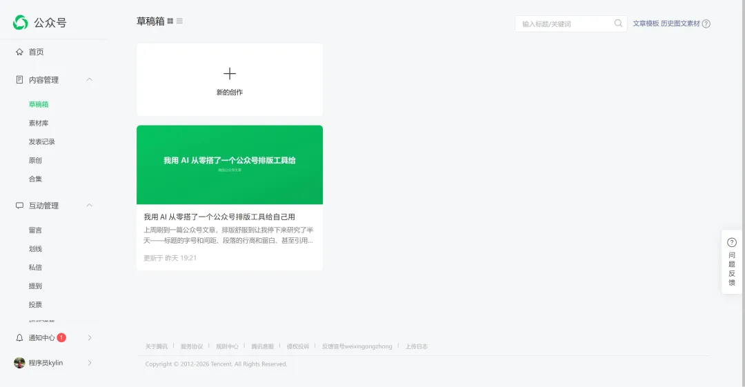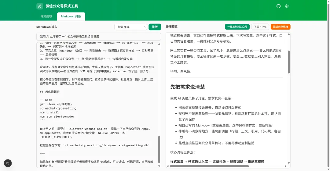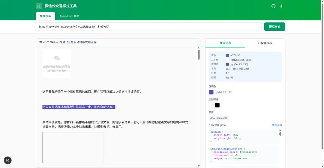 微信文章链接丢进去,自动把排版样式提取出来 提取完不是黑盒,我要先预览,看到这套样式长什么样,确认满意了再保存 把自己写的 Markdown 丢进去,选中保存的样式,重新排版 排版有不满意的地方,能局部调——标题、正文、引用、代码块,各自改 最后直接推送到公众号草稿箱,不用再手动复制粘贴