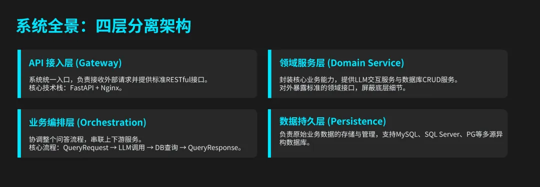 @router.post("/query", response_model=QueryResponse)async def query(request: QueryRequest):sql = llm_service.generate_sql(request.question)result = database_service.execute_query(request.db_type, sql)answer = llm_service.generate_natural_language(request.question, result)return QueryResponse(question=request.question, sql=sql, result=result, answer=answer)