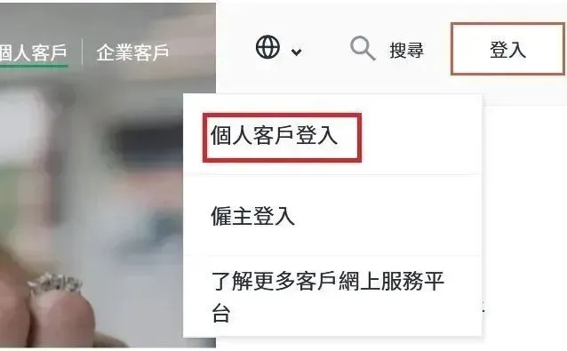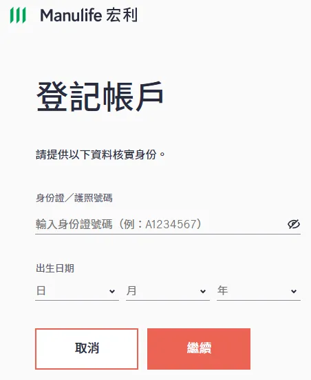 www.manulife.com.hk首页右上角按下【登入】再选择【个人客户】,按【登记账户】。