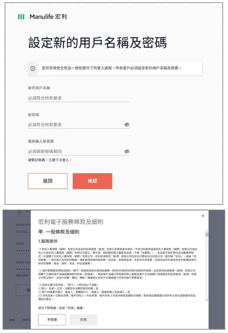 (5)输入新用户名称和密码,按【确认】。并且阅读条款及细则,并按【同意】确认接受相关条款及细则。