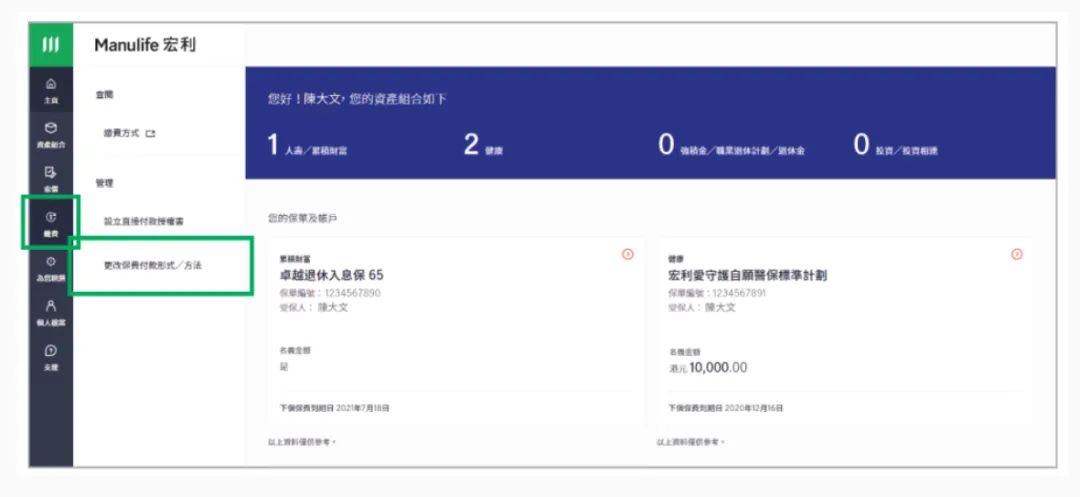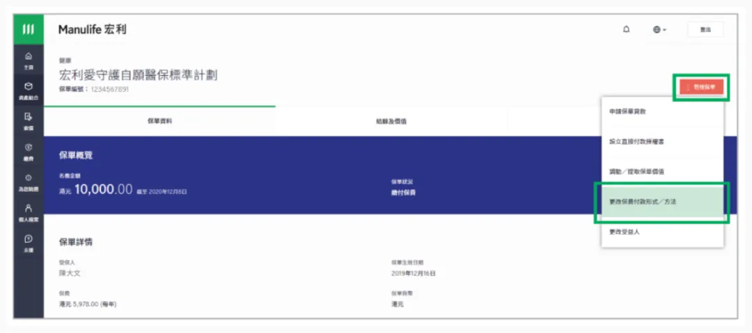 (3)或者,您可先在主页选择想更改的保单,然后点击右上角的[管理保单]快速键,再选择[更改保费付款形式/方法]。