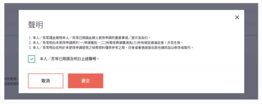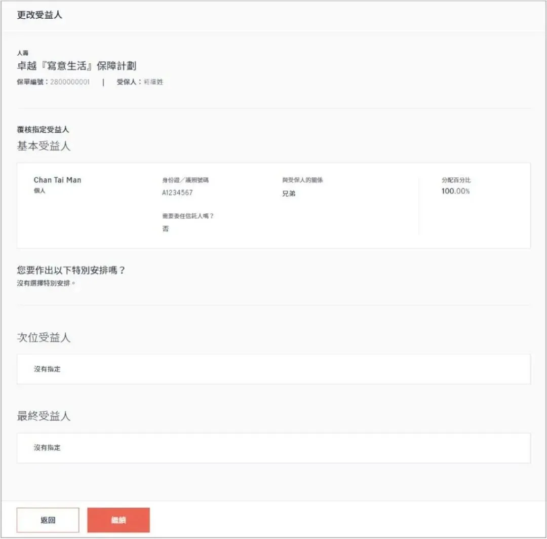 您的[更改受益人]指令一经网上递交,您将收到确认短讯及电子邮件。当批核完成后,会有确认通知书发送给您,以供核实。
