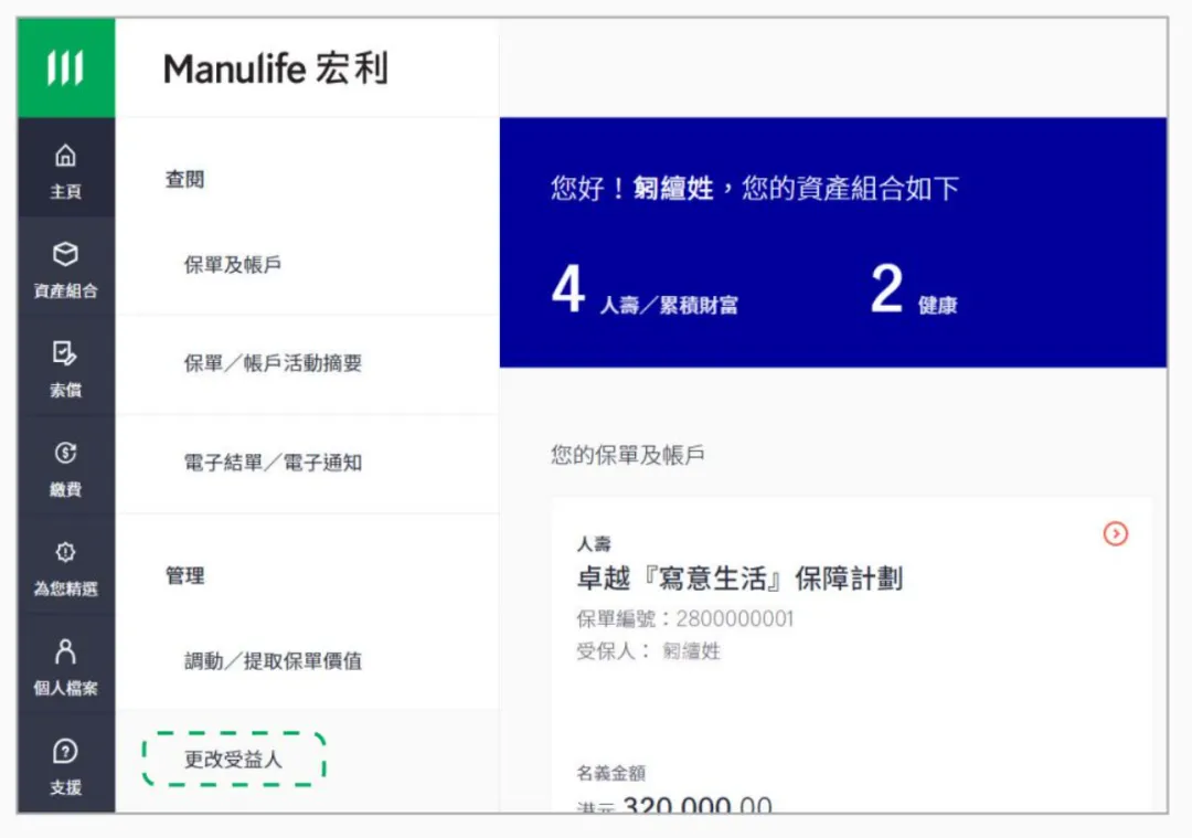 (1)在登入宏L客户网上服务平台后,您可以在目录点击[资产组合],然后选择[更改受益人]。