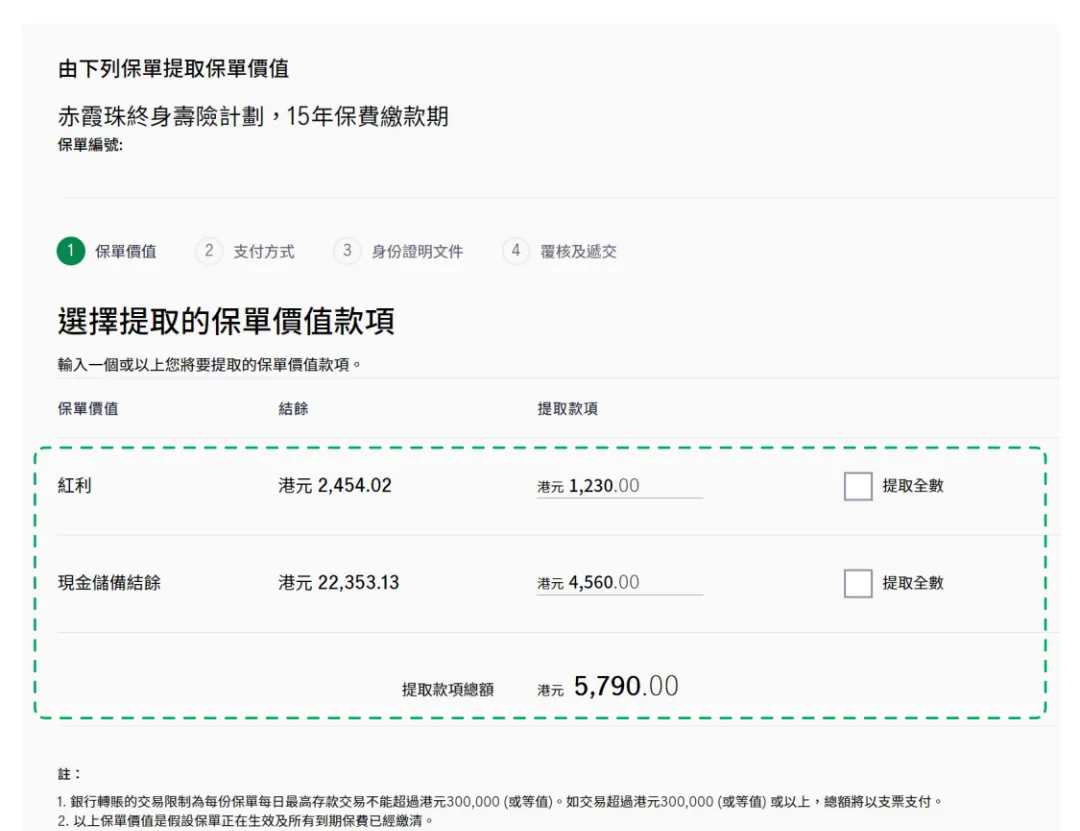 (4)您可选择以银行转账提取每份保单价值金额不多于$300,000港元。