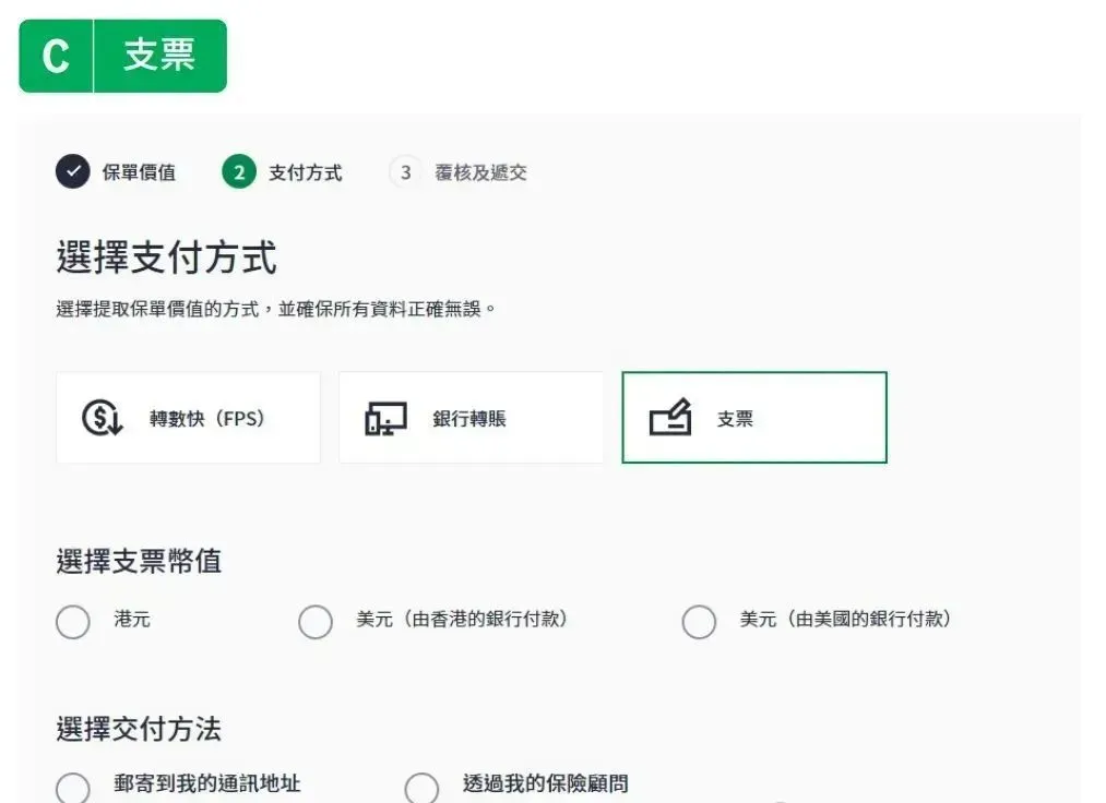 在[更改保费付款形式/方法]页面,选择您想更改的保费付款方法及/或保费付款形式。