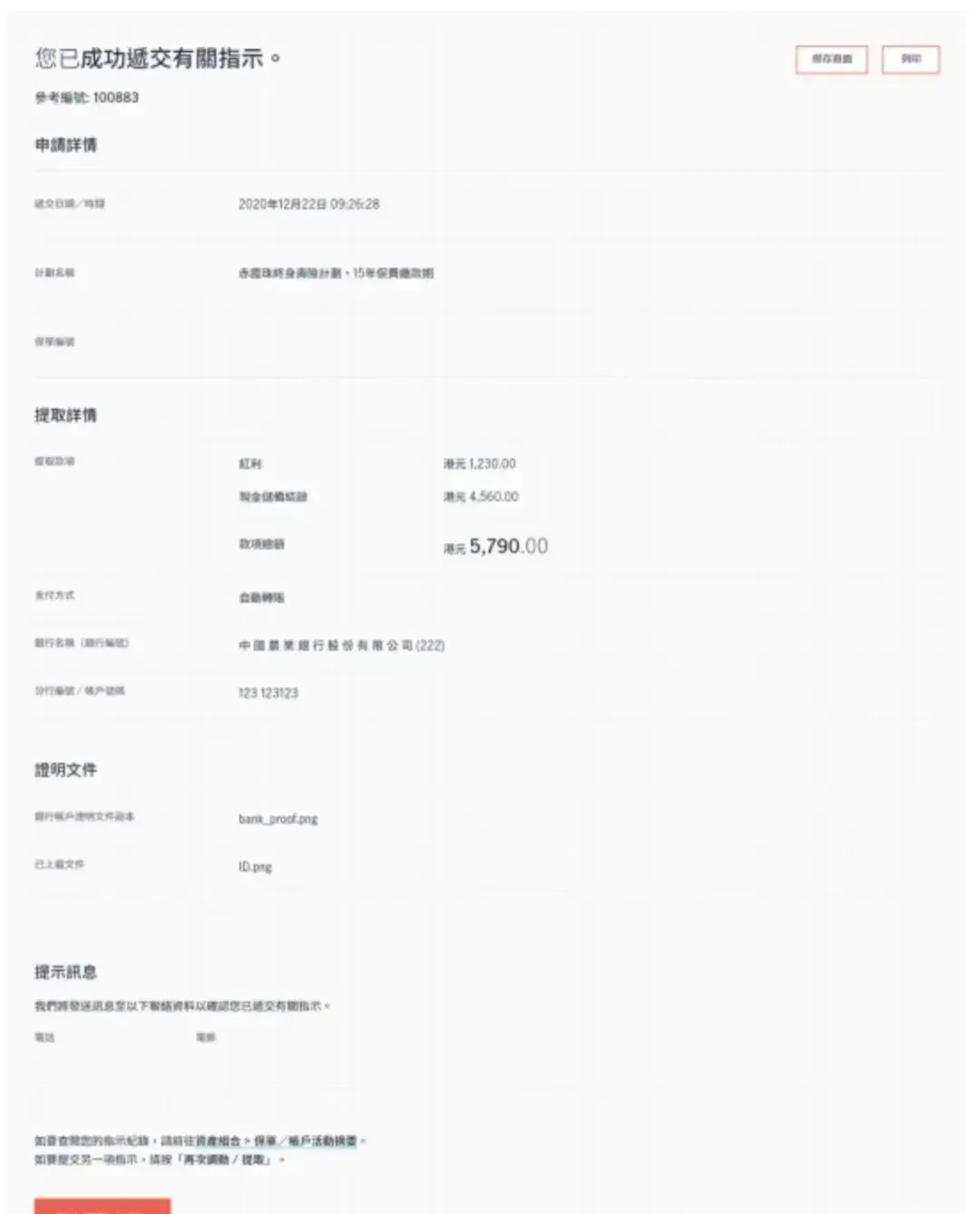 经网上递交后,您将收到短讯及电子邮件确认。您亦可于客户网站内的资产组合 > 保单 / 帐户活动摘要查阅您的指示记录。