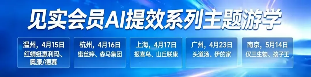 AI在2026年的重点,是进入业务环节。4月-5月见实将带领会员朋友们走进温州/杭州/上海/广州/南京的头部企业游学,观摩、学习、交流AI最新玩法。