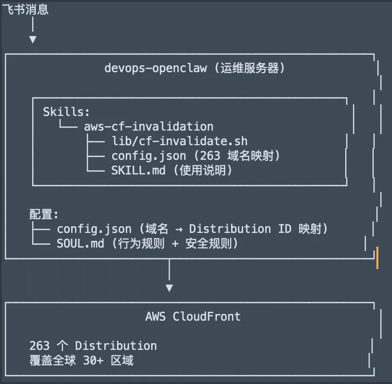 // ~/.openclaw/workspace/skills/aws-cf-invalidation/config.json{"mappings": {"img.cdn.example.com": {"distribution_id": "E1234567890ABC","cdn_type": "cloudfront","description": "图片 CDN(主力)" },"www.web.example.com": {"distribution_id": "E2E8YIE2P0HSE3","cdn_type": "cloudfront","description": "主站" },"data.api.example.com": {"distribution_id": "E3F9JKL0M1N2OP","cdn_type": "cloudfront","description": "数据 API" } }}3.4 使用方式