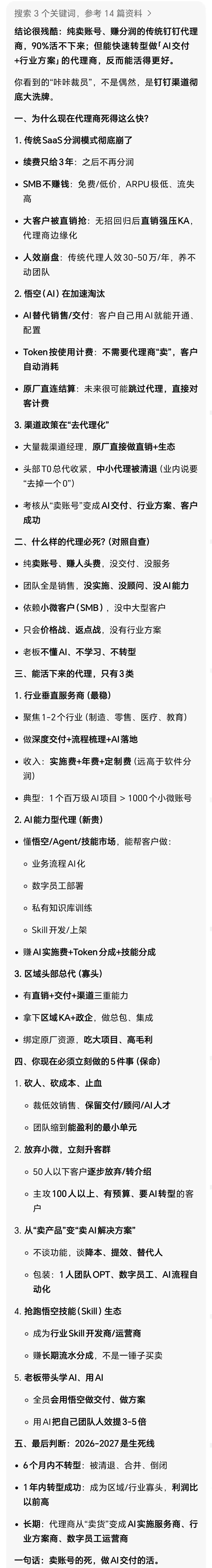 Ai时代,不限于用友/金蝶,钉企飞,致泛蓝,纷享销售易,还有层出不穷p补贴的MES,它们依旧值得代理商吗?爱渠道第5款年度服务,Ai学堂,4月正式面世!技术顾问小孟,Ai产品,Ai项目,ERP~CRM~OA~MES~iPaaS~aPaaS~Bi,复合型;【AI学堂分享会4.15直播】创业第9年,月度100万+Ai项目,谢天谢地,它们快熬出头了!商业顾问小编,股权~合伙人~合伙人制;选型~选品~第二曲线;生态~市场~销售~渠道管理,复合型;Ai(ERP+X)选品方法论那些喜欢白嫖的厂商CEO和代理商老总,心中无爱(Ai),不会有“好下场”的!爱渠道AitoB顾问,3456已就绪,全国范围猎捕ing,超级顾问团,爱渠道,定是toB圈的独一无二!我们不会给任何代理商推荐品牌;我们不会给任何厂商推荐代理商;Ai学堂,不卖一节课,无商业赞助!欢迎粉丝监督爱渠道。有任何跪舔,和薅羊毛行为,随时关闭!钉钉代理商,能活下来吗?骗补最严重的赛道是???点到为止,选品是投资,不是投机,不是选型!让我们一起强大自己,探索ERP+X的可能性。以下原创图片,是爱渠道4年+顾问41个项目(会员/顾问/陪跑)的沉淀,逐渐会把PLM,WMS,HR等领域嵌入其中,也会逐渐嵌入Bi,AI等元素。拓展阅读:用友帮帮帮,“不止”离职帮!爱渠道:搭建中国最大的“用友帮帮帮”成长社群!(年费168元,2026.01.01,起航)爱渠道:搭建中国最大的“金蝶帮帮帮”成长社群!(年费168元,2026Q2,起航)2024年中,用友把我投诉了,文章被删了,大Boss出马;2025年底,金蝶把我投诉了,文章被删了,然后打太极... ...【调研时间】“用友帮帮帮”,“金蝶帮帮帮”,“四十不惑”的意义!为什么用友离职帮,如此不团结?为什么用友离职帮,连用友都瞧不上?用友生意人帮助用友生意人,与用友原厂无关!2025上半年,拜访过珠海、广州、深圳、佛山、东莞、中山超级代理商,我想送给用友大boss两个“锦囊妙计”!原创连载ing:为什么金蝶代理商,星辰做不好星空,星空做不好星辰?金蝶代理商,为什么搞不定第二曲线?(1)金蝶代理商,为什么搞不定第二曲线?(1)——合伙人&合伙人制金蝶代理商,为什么搞不定第二曲线?(1)——ISV生态金蝶代理商,为什么搞不定OA作为第二曲线?(2)金蝶代理商,为什么搞不定OA作为第二曲线?(2)——案例时间金蝶代理商,为什么搞不定OA作为第二曲线?(2)——案例时间金蝶代理商,为什么搞不定CRM作为第二曲线?(3)——选品金蝶代理商,为什么搞不定CRM作为第二曲线?(3)——纷享/灵当左右为难金蝶MES四小龙,哪个代理商第一个营收破亿?(4)For 金蝶代理商,自研or代理MES,利与弊!苏州某MES厂商(金蝶·自研型代理商),为什么经历滑铁卢?为什么“金蝶Top代理商”,在昆明大会上被点名批评?关于“渠道事故”,金蝶boss会亲自出马吗?留幸福逆向思维者,纯屌丝一枚IT从业20年+,软件产业观察员&商业顾问关键角色:用友 CRM 渠道推进+高级咨询顾问 2009-2012Exact China 北方区负责 2012-2014ERP100核心管理员 2012-2016与中国软件网&IT大佬合作 2015红姐减肥养生馆商业顾问 2016~N家软件厂商及代理商商业顾问 2021~订阅服务1,爱社群:年度168元 ***IT帮帮帮:用友帮帮帮/金蝶帮帮帮/代理商帮帮帮/渠道经理帮帮帮...健康减肥帮帮帮/IT红娘帮帮帮/四十不惑帮帮帮2,爱学堂:年度1680元 ****投资&选品&第二曲线/合伙人&合伙人制AitoB提升:开发、市场、销售、实施、CSM等3,爱会员:年度1.68w *****专业“健康度”诊断,年度线上咨询,赠送一次线下问诊+线下会员日4,爱顾问:年度16.8w **专项能力提升,比如合伙人甄选or第二曲线启盘or生态合作or直销/渠道团队搭建等5,爱陪跑:年度36.8w *综合能力提升,比如合伙人甄选or第二曲线启盘or生态合作or直销/渠道团队搭建等增值服务问诊,666 /h,线上猎头,(1+1) 月度工资FA,5% 融资额... ...
