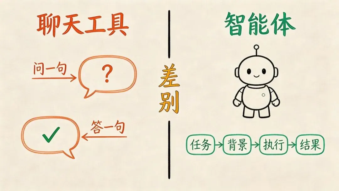 聊天工具是你问它一句,它答你一句;智能体是你交给它一件事,它自己往下做。