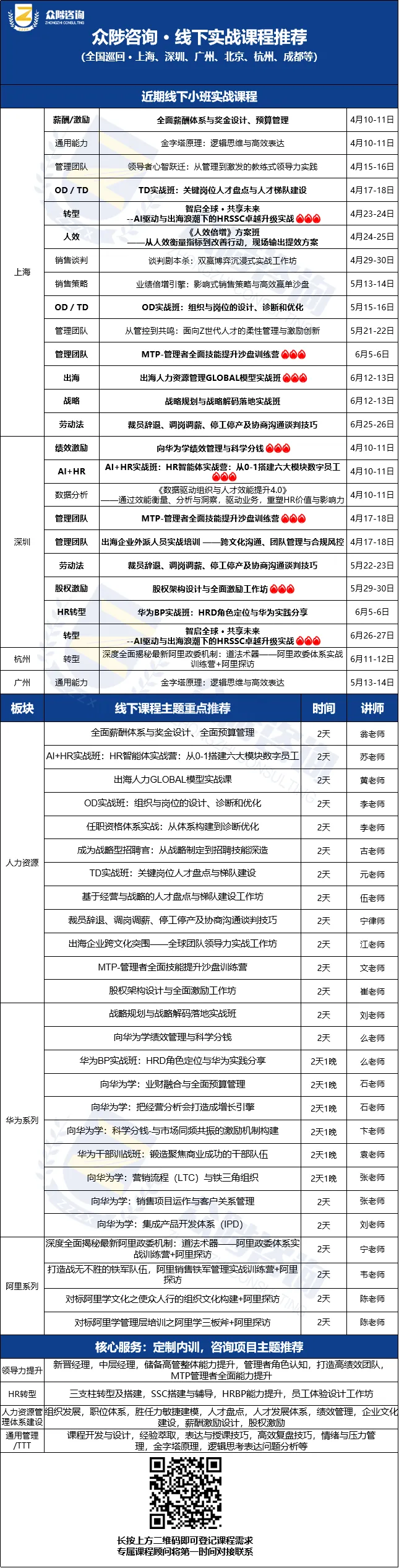 为了帮助组织构建高效、智能、可扩展的下一代人力资源共享体系,众陟咨询盛邀崔老师带来线下实战课“AI驱动与出海浪潮下的HRSSC卓越升级实战”,期待你的参与。