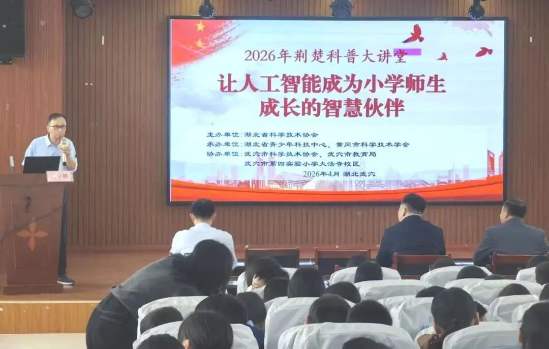 为落实教育部等五部门联合印发《“人工智能+教育”行动计划》部署要求,4月10日,2026年“荆楚科普大讲堂”走进武穴市第四实验小学大法寺校区,一堂生动有趣的人工智能科普课,让乡村校园充满了科技气息。本次活动以“让人工智能成为小学师生成长的智慧伙伴”为主题,特邀黄冈师范学院计算机与人工智能学院院长何中林教授主讲,为现场师生带来了一场兼具前沿性、实用性与趣味性的AI科普盛宴。