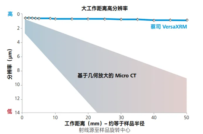 ▲蔡司VersaXRM X射线显微镜在较长工作距离内也可保持低至500 nm的亚微米空间分辨率