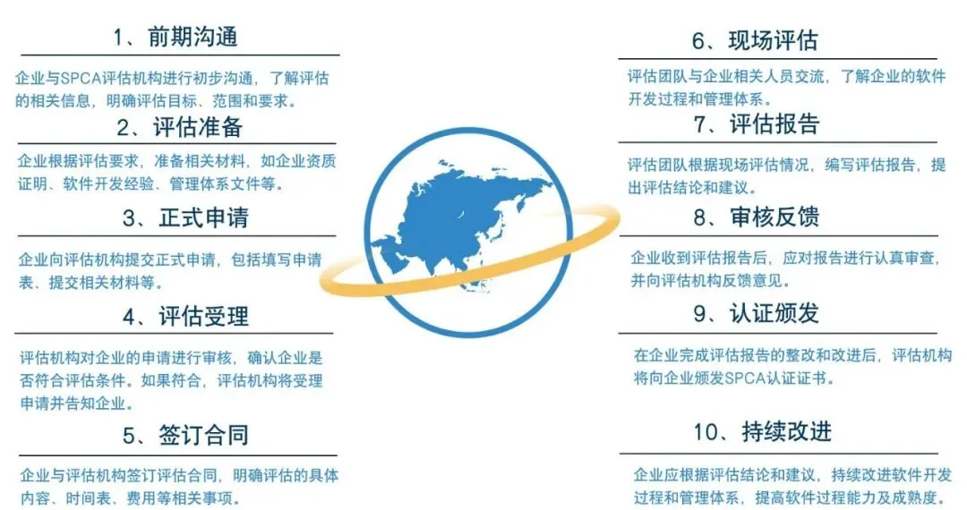 SPCA评估体系旨在帮助我国软件企业提高其软件开发过程的管理和控制能力,提升软件产品的质量和稳定性,从而增强企业的市场竞争力。评估过程依据的标准是SJ/T 11234和SJ/T 11235。
