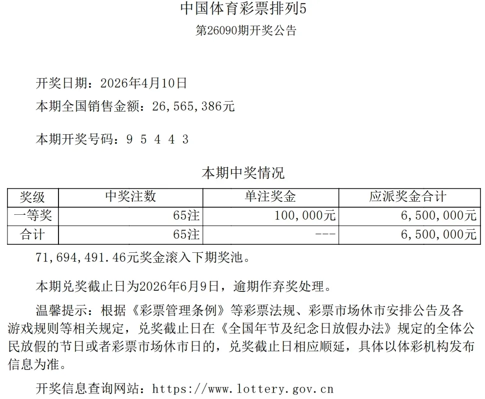 排列5(26090)开奖号码: