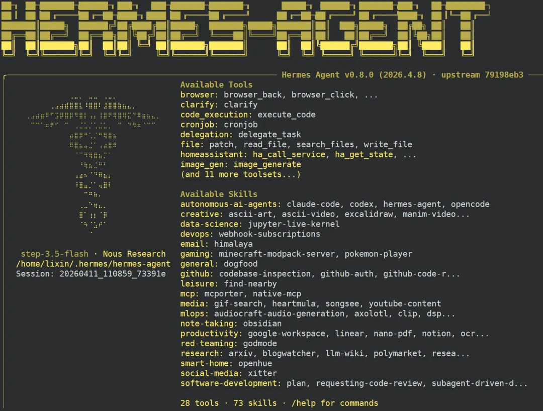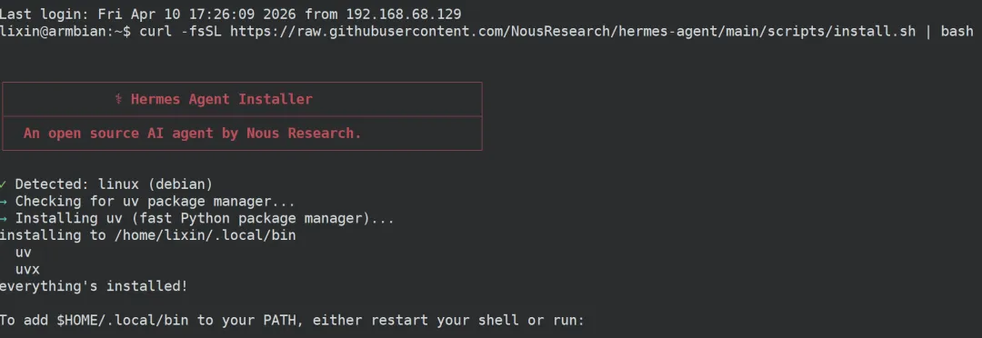 curl -fsSL https://raw.githubusercontent.com/NousResearch/hermes-agent/main/scripts/install.sh | bash